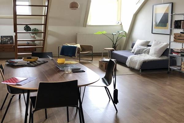 De badkamer beschikt over een douche en wastafel, en er is een separaat toilet. Vanuit de woonkamer leidt een trap naar het gezellige slaapvertrek. Het hele appartement is afgewerkt met een nette laminaatvloer, wat zorgt voor een moderne en verzorgde uitstraling.