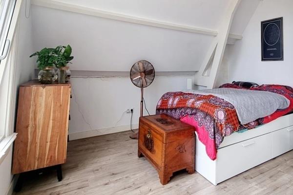 Op de vierde etage vindt u de slaapkamer, die een rustige en lichte ruimte biedt. De badkamer is modern en stijlvol, met een ligbad, regendouche en een prachtig verlichte spiegel. Het interieur van de woning is goed onderhouden, met veel natuurlijke lichtinval en een moderne afwerking.