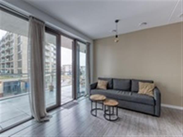 De riante woonkamer is voorzien van grote raampartijen en biedt toegang tot het zeer ruime terras, gelegen op het noordoosten, met uitzicht op de promenade en zee, de ideale plek om gasten te entertainen of lekker te ontspannen. De open keuken is van alle gemakken voorzien en beschikt over een inductie kookplaat met afzuigkap, vaatwasser, combi-oven, koelkast en vriezer. Daarnaast is er voldoende bergruimte.