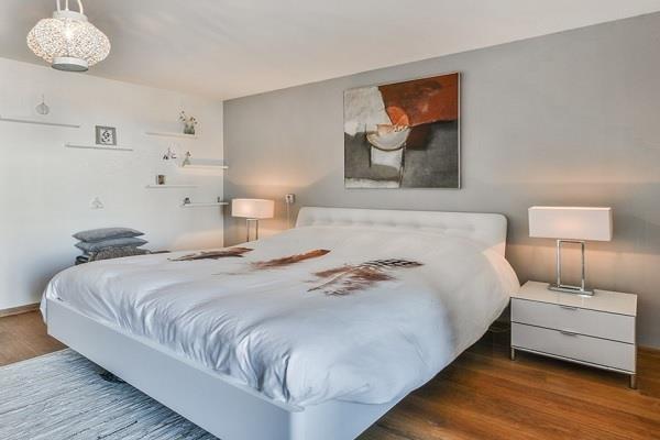 De riante slaapkamer aan de achterzijde geeft toegang tot het balkon, met uitzicht op de zeer gezellige gemeenschappelijke binnentuin, welke via een achterom bereikbaar is. De badkamer is voorzien van een dubbele wastafel met meubel, een inloopdouche en een handdoekradiator.
