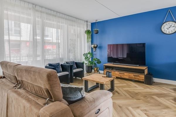 Aan het einde van de hal kom je in de royale woonkamer van circa 39 m² met open keuken. Dankzij de grote raampartijen is dit een bijzonder lichte en prettige leefruimte. De open keuken sluit mooi aan op de woonkamer en biedt voldoende ruimte voor koken en gezellig. Vanuit de woonkamer is het ruime balkon bereikbaar, een fijne plek om buiten te zitten en te genieten van de omgeving.