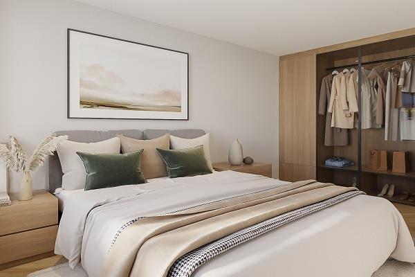 Via de centrale entree op de begane grond brengt de lift je naar het dakniveau, waar je uitkomt op het gezamenlijke dakterras en de voordeur van de woning. Binnen leidt de hal naar twee slaapkamers, de badkamer, een separaat toilet, een inpandige berging en de lichte woonkamer met open keuken. Vanuit de woonkamer heb je direct toegang tot het dakterras.