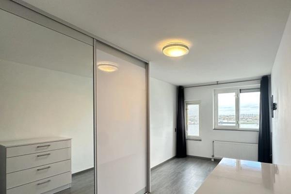 De woonkamer is opvallend licht dankzij de grote raampartijen die zorgen voor veel daglicht en een prachtig uitzicht over de Maas en de skyline van Rotterdam. De ruimte is strak afgewerkt, voorzien van een modern tv-meubel en biedt volop mogelijkheden om geheel naar eigen wens in te richten.