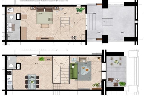 Deze is verdeeld in een woon- en eetkamer op verschillende hoogtes. Het plafond is zeer hoog.