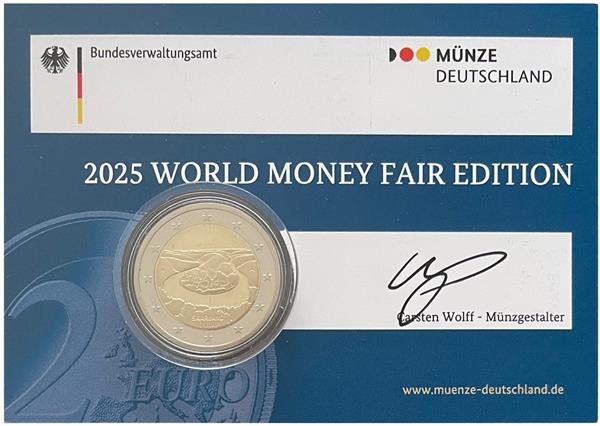 Duitsland Coincard World Money Fair 2025 'Saarland' Letter A. Duitsland heeft op de World Money Fair de bijzondere 2 Euromunt 'Saarland' in PROOF uitgegeven. Deze kent een oplage van slechts 500 exemplaren. Dit is de tweede keer dat Duitsland een Proofmunt uitgegeven met zo'n kleine oplage! Saarland is een deelstaat dat ligt in het zuidwesten van Duitsland. Er wonen ruim 1 miljoen mensen in deze deelstaat en Saarland kent een oppervlakte van 2.571 vierkante kilometer. De hoofdstad van deze deelstaat is: Saarbrücken. Saarland grenst zowel aan Luxemburg als Frankrijk! Deze Duitse Coincard World Money Fair Proof is ondertekend door de ontwerper van deze munt: Carsten Wolff. Bij Eurocoinhouse kunt u allerlei verschillende soorten euromunten kopen, maar ook accessoires, sets en bijzondere uitgaves van herdenkingsmunten.