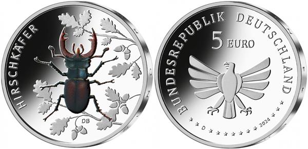 Duitsland 5 Euro 2024 'Hertkever'. Duitsland heeft een bijzondere 5 Euromunt met als thema: Hertkever. Een Hertkever (ook wel een vliegend hert) genoemd is één van de grootste kevers dat voorkomt in Europa en kunnen ruim 10 centimeter groot worden! Ze hebben hun naam te danken aan de enorme kaken die de mannetjes hebben. De kaken dienen alleen om te imponeren, ze kunnen niet krachtig worden samengetrokken zoals vele mensen denken! Ze leven het liefste in vochtig / verrot hout zodat hun larven hier de schimmels van de bomen kunnen eten. Hertkevers kunnen 10 jaar oud worden maar komen steeds minder voor in Europa. Op de voorkant van de munt ziet men een mannetjes Hertkever met zijn imposante kaken en wordt zijn naam in het Duits (Hirschkäfer) weergegeven. Op de achterkant van de munt staat de tekst: Bundesrepublik Deutschland (Bondsrepubliek Duitsland), wordt de waardeaanduiding van 5 Euro weergegeven en ziet men het jaartal van uitgifte, 2024. De bekende adelaar staat gecentreerd in het midden. De munt is verpakt in een bedrukte munthouder. Bij Eurocoinhouse kunt u allerlei verschillende soorten euromunten kopen, maar ook accessoires, sets en bijzondere uitgaves van herdenkingsmunten.