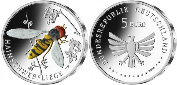 Duitsland 5 Euro 2024 'Pyjamazweefvlieg'. Duitsland geeft een serie 5 Euromunten uit met als thema: De wonderschone wereld van de insecten. Deze serie bestaat in totaal uit 9 verschillende munten waarvan dit de zevende uit deze serie is. Het insectenrijk is van cruciaal belang voor de aarde. Zonder insecten overleven we niet en zou er binnen een jaar of 10 - 20 een wereldwijde ecologische armageddon plaatsvinden. Insecten zorgen voor bestuiving van planten, bloemen en gewassen. Op de voorkant van de munt ziet men een Pyjamazweefvlieg en wordt zijn naam in het Duits: HAINSCHWEBFLIEGE weergegeven. Op de achterkant van de munt staat de tekst: Bundesrepublik Deutschland (Bondsrepubliek Duitsland), wordt de waardeaanduiding van 5 Euro weergegeven en ziet men het jaartal van uitgifte, 2024. De bekende adelaar staat gecentreerd in het midden. De munt is verpakt in een bedrukte munthouder. Bij Eurocoinhouse kunt u allerlei verschillende soorten euromunten kopen, maar ook accessoires, sets en bijzondere uitgaves van herdenkingsmunten.