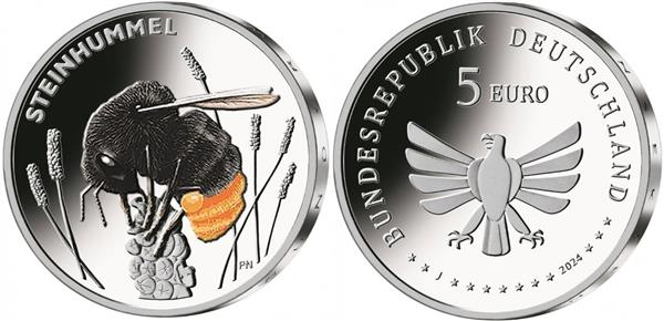 Duitsland 5 Euro 2024 'Steenhommel'. Duitsland heeft een bijzondere 5 Euromunt uitgegeven met als thema: de Steenhommel. De Steenhommel (Bombus Lapidarius) is een hommel die in heel Europa voorkomt. De vrouwtjes zijn te herkennen aan hun achterlijf dat helderrood gekleurd is. De mannetjes herkend men aan de lichtgele snuit met een lichtgele band over het borststuk. Een kolonie bestaat uit ongeveer 250 werksters en kent slechts 1 Koningin! De nesten vind men vaak in muurspleten, schuren, stalen of in boomschors. Op de voorkant van de munt ziet men een Steenhommel en wordt de naam in het Duits (Steinhummel) weergegeven. Op de achterkant van de munt staat de tekst: Bundesrepublik Deutschland (Bondsrepubliek Duitsland) wordt het jaartal van uitgifte, 2024 weergegeven en wordt de waardeaanduiding van 5 Euro weergegeven. De bekende adelaar staat gecentreerd in het midden. De munt is verpakt in een bedrukte munthouder. Bij Eurocoinhouse kunt u allerlei verschillende soorten euromunten kopen, maar ook accessoires, sets en bijzondere uitgaves van herdenkingsmunten.