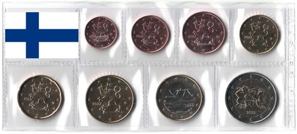 Finland UNC 2022. De munten van Finland 2022 zullen zeer zeker niet allemaal in circulatie komen. Deze complete set Finse munten van het jaar 2022 bevat 8 munten, de 1 cent 2022 tot en met de normale 2 Euro 2022. Onmiddellijk nadat in het jaar 2002 de Euro in Finland werd ingevoerd werden de 1 cent munten en 2 cent munten al uit de circulatie gehaald en deze munten zijn altijd een gewild verzamelobject gebleven. Op de 1 cent munten tot en met de 50 cent munten ziet men de leeuw van het wapen van Finland. Aan de linkerkant van deze munten ziet men het jaartal 2022. Op de 1 Euromunt ziet men een tweetal zwanen die over het typische Finse landschap vliegen. Het jaartal 2022 ziet men rechts onder in het landschap verwerkt. Op de 2 Euromunt ziet men een afbeelding van een Kruipbraam (Robus Chamaemorus), een typische plant die in Finland groeit en temperaturen tot wel minus 45 graden kan doorstaan! Het jaartal 2022 ziet men aan de onderkant van deze 2 Euromunt. Bij Eurocoinhouse kunt u allerlei verschillende soorten euromunten kopen, maar ook accessoires, sets en bijzondere uitgaves van herdenkingsmunten.