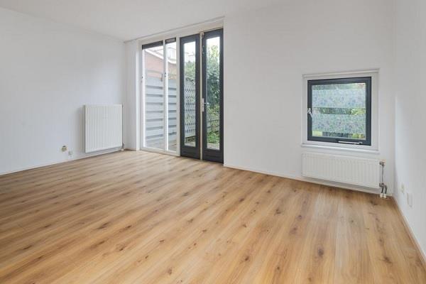 Ruime hal, betegeld hangend toilet met fonteintje en meterkast. Toegang tot de lichte en ruime woonkamer. Over de gehele breedte van de woonkamer raampartijen wat een gezellige, sfeervolle uitstraling geeft. Vanuit de woonkamer toegang tot de keuken uitgevoerd met inbouwapparatuur, o.a. koelkast, vriezer, gasfornuis met afzuigkap, vaatwasser, oven en magnetroncombinatie. Vanuit de woonkamer toegang tot de ruime en zonnige tuin met schuur en achterom. Opgang naar eerste verdieping.