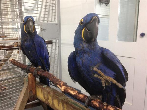 Deze baby mannelijke en vrouwelijke hyacint ara's en blauw en goud is volledig gespeend en klaar voor zijn eeuwige familie. Onze ara's zijn absoluut uitstekende metgezellen. Ze zijn populair vanwege hun rustige, lieve, speelse en liefdevolle karakters. Ze hebben een zeer vetrijk dieet nodig, dat voornamelijk bestaat uit Macadamia-noten aangevuld met andere noten, zaden, korrels, fruit en groenten. Bij Parrot Stars richten we ons op onderwijs, voeding en natuurbehoud. We werken heel hard om onze klanten voor te lichten over het gezelschap van papegaaien. Voordat we een vogel mee naar huis nemen, geven we informatie over goede huisvesting, het creëren van een veilige omgeving, voeding, gedrag, hormonen en nog veel meer. Geen enkele vraag zal onbeantwoord blijven. Elke baby die met de hand wordt gevoed, wordt gespeend op een gevarieerd dieet. Ze worden gespeend op fruit en groenten. Alleen serieuze vragen.