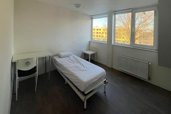 De kamer is voorzien van eenpersoonsbed, kledingkast en bureau met stoel.