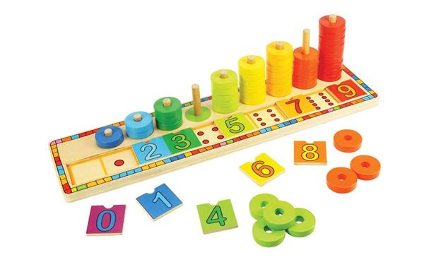 Deze bekroonde educatieve houten puzzel is een leuke introductie tot wiskunde en rekenvaardigheden. Leg de genummerde houten getalkaarten op de juiste plaats door het aantal stippen te tellen. Tel vervolgens het aantal ringen van elke kleur en schuif ze over de pin bij het juiste cijfer. Helpt bij het ontwikkelen van behendigheid en concentratie.