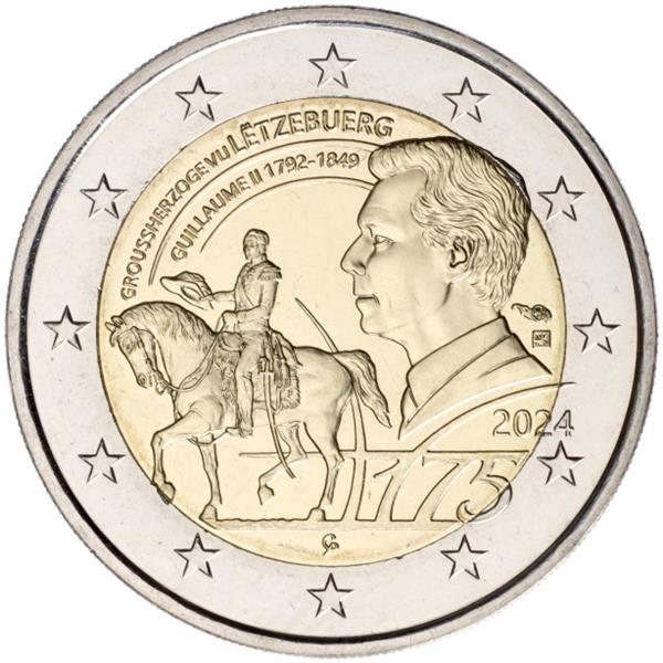 Luxemburg 2 Euro 2024 'Groothertog Willem II' UNC. Luxemburg heeft een bijzondere 2 Euromunt uitgegeven in 2024 met als thema: Groothertog Willem II. Groothertog Willem II (12-06-1792 / 17-03-1849) was Koning van Nederland en Groothertog van Luxemburg. Hij werd geboren op 12 juni 1792 in Den Haag. Hij werd op 48 jarige leeftijd Groothertog van Luxemburg op 7 oktober 1840. Groothertog Willem II tekende de Grondwetsherziening van 1848. Deze Grondwetsherziening was vooral de verdienste van de liberaal: Thorbecke die de nieuwe grondwet bijna volledig had geschreven! Hij kreeg in zijn leven 5 kinderen waarbij hij werd opgevolgd door zijn oudste zoon: de Prins van Oranje, Groot Hertog Willem III. Deze Luxemburgse 2 Euro 2024: 'Groothertog Willem II' UNC is verpakt in een bedrukte munthouder. Bij Eurocoinhouse kunt u allerlei verschillende soorten euromunten kopen, maar ook accessoires, sets en bijzondere uitgaves van herdenkingsmunten.
