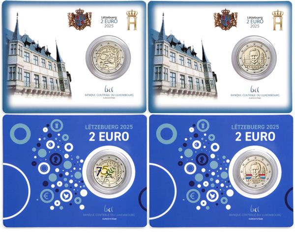 NIEUW: 4 Coincards Luxemburg! VOORVERKOOP! Luxemburg heeft dit jaar 4 verschillende Coincards uitgegeven waarvan 2 Coincards zelfs gekleurde 2 Euromunten bevatten! Hier ontvangt U alle 4 Coincards. Let op: De oplage van deze Coincards zijn slechts 5. 000 exemplaren! Normaliter waren de oplages 7.500 en standaard uitverkocht, deze 4 Coincards zijn met een oplage van 5.000 dus nog zeldzamer! Daarnaast bevatten alle 4 Coincards de Munttekens: Mercuriusstaf + Raaf. Dit betekent dat de munten geslagen zijn in Nederland. In deze serie ontvangt U de volgende Coincards: (1) Luxemburg 2 Euro 2025 '25 Jaar Groothertog Henri' Coincard + Muntteken. (2) Luxemburg 2 Euro 2025 '25 Jaar Groothertog Henri' Coincard Gekleurd + Muntteken. (3) Luxemburg 2 Euro 2025 '75 Jaar Schumanverklaring' Coincard + Muntteken. (4) Luxemburg 2 Euro 2025 '75 Jaar Schumanverklaring' Coincard Gekleurd + Muntteken. Let op: OP = OP. Bij Eurocoinhouse kunt u allerlei verschillende soorten euromunten kopen, maar ook accessoires, sets en bijzondere uitgaves van herdenkingsmunten.