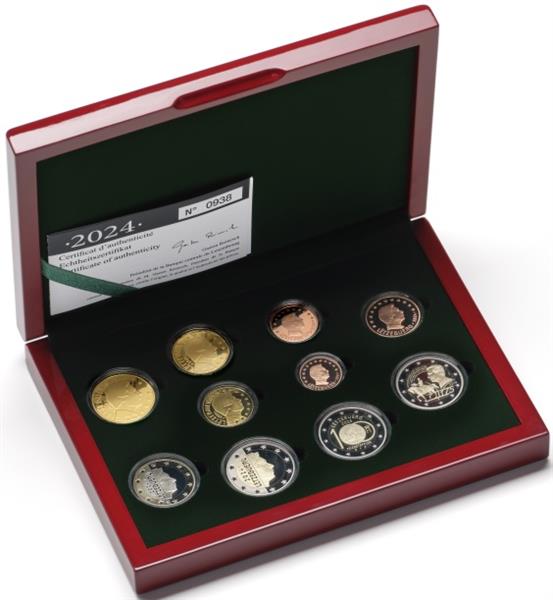 Luxemburg Proofset 2024. Dit is de Proofset van Luxemburg 2024. Deze set bevat in totaal maar liefst 10 munten in de kwaliteit Proof. In deze Proofset zitten dus 2 extra munten, dit zijn de 2 Euro 2024 '100 Jaar 1 Frank - Gieterij Arbeider' en de 2 Euro 2024 'Groothertog Willem II'. Het bijzondere van deze set is dat bijzondere 2 Euromunten de Muntteken Mercuriusstaf en het Muntmeesterteken Raaf bevatten. Verder ziet men het teken van de ontwerper: Chiara Principeen. De oplage van deze Proofset is slechts 1.000 stuks en was binnen 5 minuten uitverkocht dus wees er snel bij. Let op maximaal: 1 Per Persoon! Bij Eurocoinhouse kunt u allerlei verschillende soorten euromunten kopen, maar ook accessoires, sets en bijzondere uitgaves van herdenkingsmunten.