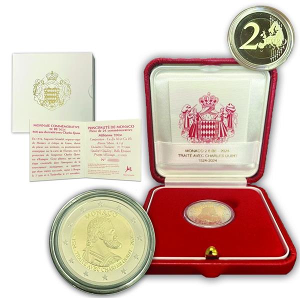 Monaco 2 Euro 2024 'Verdrag van Burgos - Karel V'. Monaco heeft een bijzondere 2 Euromunt uitgegeven met als thema: 500 Jr. Verdrag van Burgos - Karel V. Keizer Karel V (Charles Quint) regeerde over één van de grootste rijken dat Europa gekend heeft: Het Spaanse Rijk. Karel V was overtuigd van de strategische ligging van Monaco en sloot hierdoor een verdrag af met Augustin Grimaldi, genaamd: Het verdrag van Burgos. Dit verdrag werd gewijzigd en aangevuld door het verdrag van Tordesillas. Hierdoor werd Monaco onder bescherming geplaats van Karel V waardoor de eminente soevereiniteit van Monaco werd erkend. In 1529 werd Karel V hiervoor zelfs gekroond door de Paus. Omdat het verdrag van Burgos 500 jaar geleden getekend werd, heeft Monaco besloten om hier een bijzondere 2 Euromunt over uit te geven. Op de voorkant van deze 2 Euro 2024 van Monaco ziet men een afbeelding van Karel V (Charles Quint) naar rechts kijkend. Verder ziet men de jaartallen 1524 en 2024. Verder ziet men de tekst: TRAITE AVEC CHARLES QUINT (Verdrag met Karel V). Tot slot ziet men bovenin de landsnaam: Monaco. Deze bijzondere 2 Euro van Monaco 2024 'Verdrag van Burgos - Karel V' is verpakt in een schitterende cassette en wordt met een echtheidscertificaat geleverd. De oplage van deze munt is slechts 15.000 exemplaren! Bij Eurocoinhouse kunt u allerlei verschillende soorten euromunten kopen, maar ook accessoires, sets en bijzondere uitgaves van herdenkingsmunten.