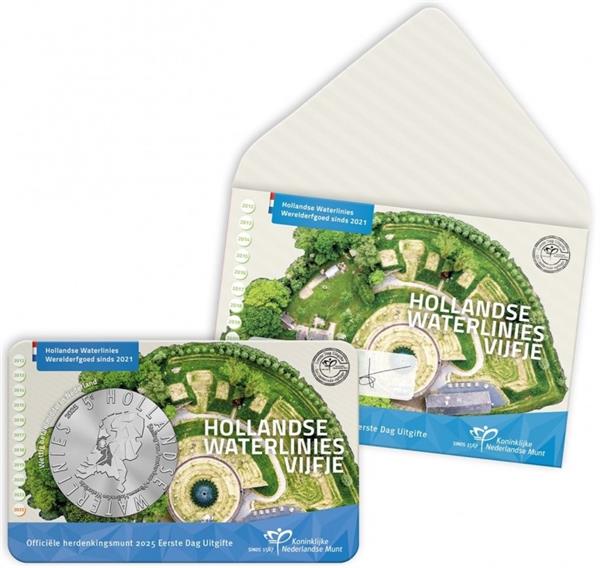 Nederland 5 Euro 2025 'Hollandse Waterlinies' Coincard Eerste Dag Uitgifte. De Hollandse Waterlinies zijn twee historische verdedigingslinies. Deze bestonden uit de Nieuwe Hollandse Waterlinie en de Stelling van Amsterdam. Deze zijn beide sinds 2021 UNESCO Werelderfgoed! De Hollandse Waterlinies waren zo gemaakt dat wanneer er oorlog uit zou breken, Nederland voor een groot deel onder water kwam te staan zodat soldaten vroeger niet of moeilijk het Westen konden bereiken. De Hollandse Waterlinie is bijna 250 kilometer lang en bestond uit bijna 100 forten, 2 kastelenen vele vestingen en honderden militaire sluizen, dijken en kanalen. Het mooie? Het is nooit gebruikt. Toch laat het wel zien hoe Nederland in staat om met het water om te gaan! Op de voorkant van de munt ziet men de landkaart van Nederland en verder wordt de naam van dit grote bouwwerk: Hollandse Waterlinies weergegeven. Op de achterkant ziet men Koning Willem-Alexander en wordt zijn naam eveneens weergegeven. Deze bijzondere 5 Euromunt: Hollandse Waterlinies is verpakt in de standaard Eerste Dag Uitgifte Envelop en wordt met een genummerde Coincard geleverd. Bij Eurocoinhouse kunt u allerlei verschillende soorten euromunten kopen, maar ook accessoires, sets en bijzondere uitgaves van herdenkingsmunten.
