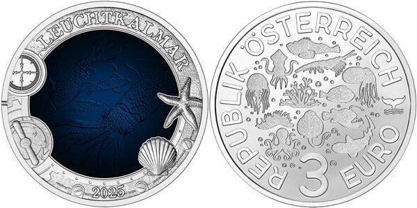 Oostenrijk 3 Euro 2025 'Lichtgevende Inktvis'. Oostenrijk heeft zijn tiende munt uit de serie: Diepzeedieren uitgegeven met als onderwerp de Inktvis. Inktvissen behoren tot groep: weekdieren. Ze hebben hun naan gekregen omdat ze natuurlijk in staat zijn om inkt te spuiten. Inktvissen leven in zoutwater en je kunt ze overal ter wereld tegenkomen. Ze eten voornamelijk kreeften, krabben en andere kleine vissen. Ze verschuilen zich vaak in het zand of tussen kleine rotspleten waarbij ze hun prooien vangen met hun grijparmen waarop vele zuignappen zitten. Het zijn intelligente dieren die van camouflage een ware kunst hebben weten te maken! Op de voorkant van de munt ziet men een inktvis in het donker, daar waar ze leven, diep in de zee. De achterkant van deze serie munten is gelijk. Men ziet een silhouet van elk zeedier uit deze 12-delige serie. Verder ziet men in een cirkel de landsnaam: Republik Österreich (Oostenrijk) en wordt de waardeaanduiding van 3 Euro weergegeven. De munt is verpakt in een bedrukte munthouder. Bij Eurocoinhouse kunt u allerlei verschillende soorten euromunten kopen, maar ook accessoires, sets en bijzondere uitgaves van herdenkingsmunten.