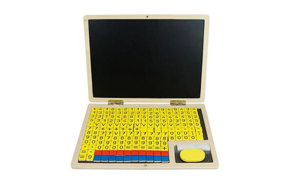 Met deze reken laptop van hout kunnen kinderen de getallen leren en de eerste rekenopdrachten uitvoeren, getalwaarden vergelijken en zelf experimenteren. Het beeldscherm is een magnetisch bordoppervlak, dat met krijt beschreven kan worden of van magneten voorzien kan worden. Het grondvlak is eveneens   magnetisch en voorzien van 5 lijnen voor een betere orïentatie. Met de magnetische houten tegeltjes kan zowel op het bord als op het grondvlak gewerkt worden.