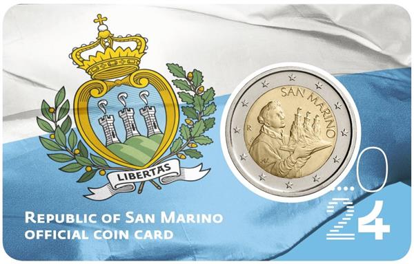 San Marino Coincard 2 Euro 2024. San Marino heeft een bijzondere Coincard uitgegeven in het jaar 2024. Op de voorkant van deze Coincard ziet men het wapen van San Marino. De Coincard is dusdanig ontworpen dat de kleuren van de vlag (blauw en wit) naar voren komen op deze Coincard. Op deze Normale 2 Euro van 2024 ziet men een detail van het schilderij Madonna in Gloria. Dit schilderij is rond het jaar 1640 geschilderd door Giovan Battista Urbinelli ook genaamd Urbinelli van Urbino. Het schilderij hangt in het Nationale Museum van San Marino. Op de munt ziet men een detail van het schilderij waar men Sint Marino ziet die als het ware San Marino (de drie Torens) beschermend in zijn handen neemt. Rechts boven ziet men de landsnaam San Marino en rechts onder ziet men het jaartal 2024. In de buitenste ring van de munt ziet men de 12 sterren van Europa. Bij Eurocoinhouse kunt u allerlei verschillende soorten euromunten kopen, maar ook accessoires, sets en bijzondere uitgaves van herdenkingsmunten.