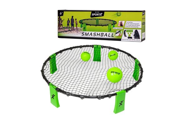 SportX Smashball. Begin het spel door de bal met de hand op het net te slaan in de richting van de tegenstander. Elk team mag de bal maximaal drie keer raken, voordat de bal naar het net moet worden gespeeld en het spel overgaat naar het andere team. De bal mag door een teamlid worden geslagen, gemept of gesmasht. Het serverende team blijft serveren totdat de tegenpartij een punt wint en de opslag overgaat naar het andere team. Je speelt maximaal 21 punten per game. De winnaar van twee van de drie games wint het spel! Erg leuk buitenspeelgoed, om mee te spelen op een grasveld of op het strand! Wordt geleverd in full-colour doos. Geschikt voor kinderen vanaf 7 jaar.
