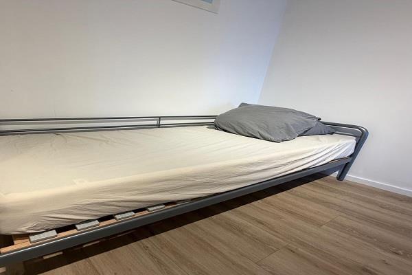 Woonkamer met open keuken en de nodige keukenapparatuur