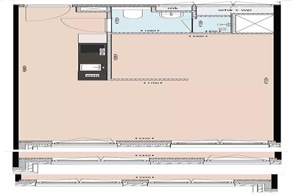 In de badkamer is plek voor een wasmachine. Door de efficiënte opzet blijft de rest van de studio overzichtelijk en goed in te delen naar je eigen smaak.