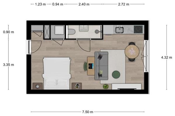 Het betreft een compact en slim ingedeelde studio van circa 32m², voorzien van een moderne badkamer met douche, toilet en wastafel, een complete keuken en een PVC-vloer. Het beschikt over een gezamenlijke buitenruimte.