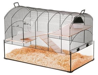 De Zolux Knaagdierkooi Neo Nigha Panas Glas / Tralies Zwart van 71 x 41 x 49 cm is een kooi met een glazen onderbak met twee verdiepingen en een huisje, ideaal voor gerbils.